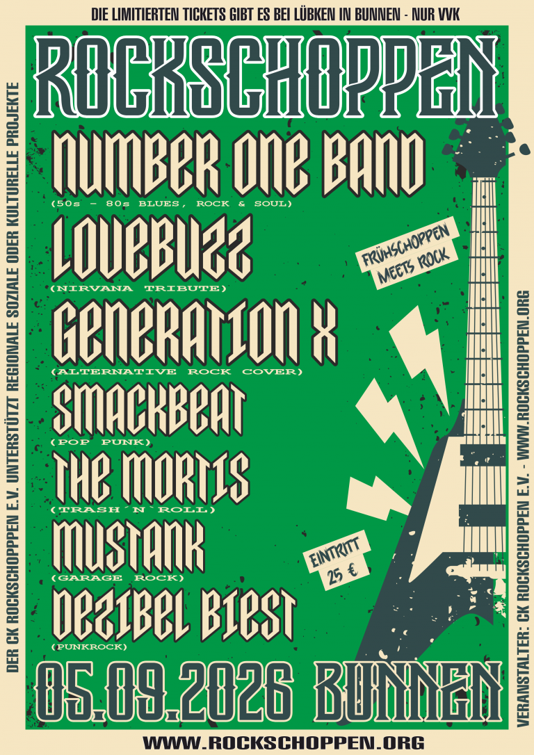 Am 05. September 2026 findet das zweite „CK-Rockschoppen Festival“ in Bunnen statt. Das Festival wird ehrenamtlich durch den „CK ROCKSCHOPPEN e.V.“ organisiert, der Verein hat sich nicht nur die Förderung der Rockmusik, mit all ihrenFacetten auf die Fahnen geschrieben, sondern unterstützt ebenfalls soziale und kulturelle Projekte in…